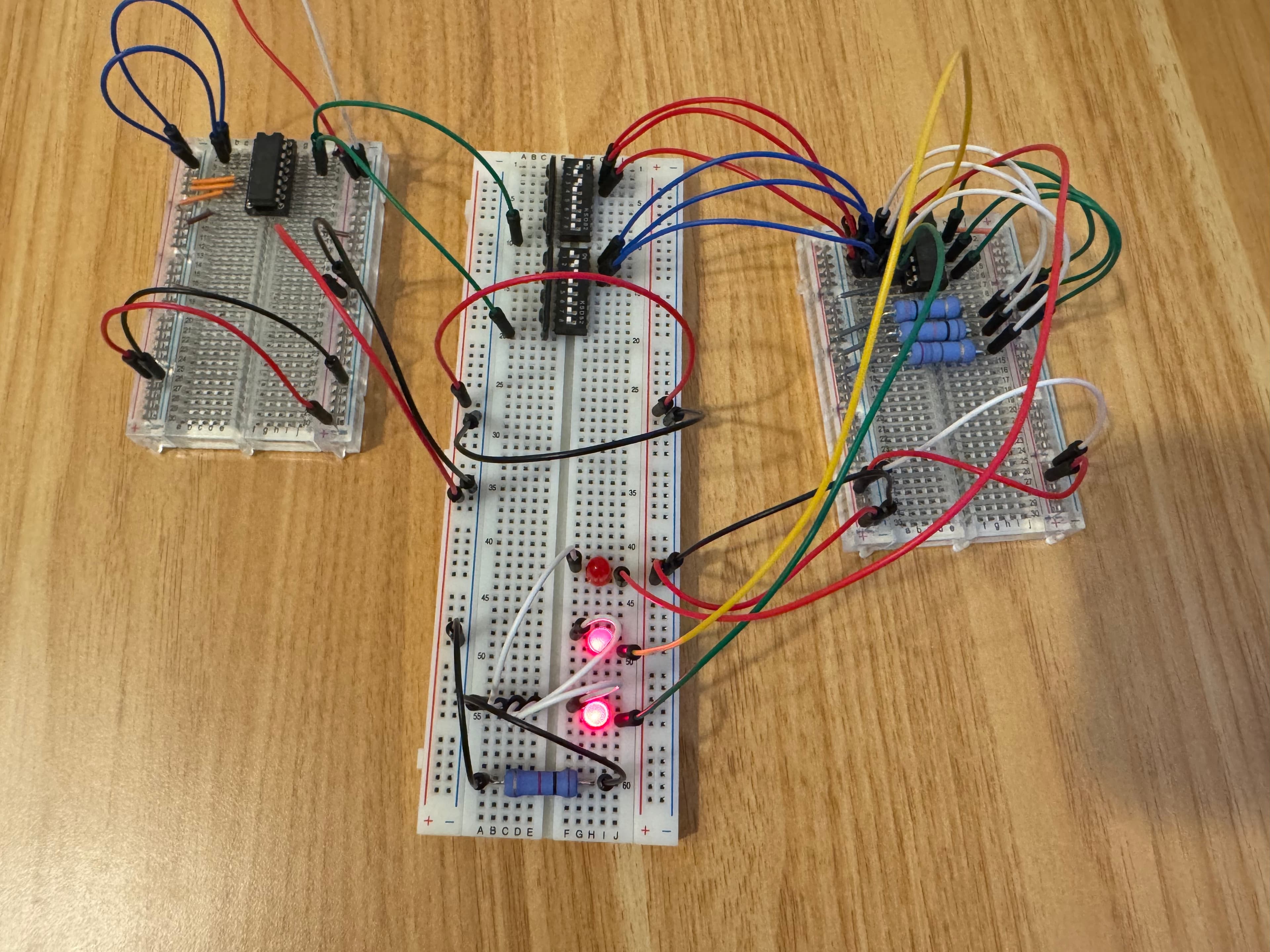 ROMとCPU本体については、ブレッドボードで組み立てることができないほど複雑だったため、細かく分解して動作を確認しました。ROMについては、2アドレスを上位3ビットだけ動作確認しました。