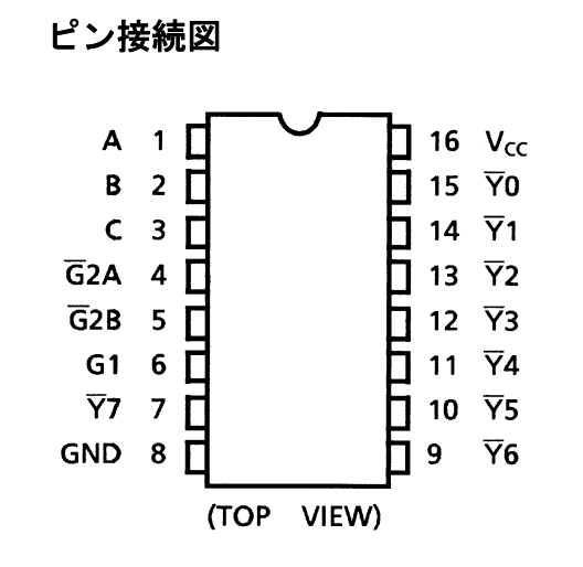 74HC138は、1つのイネーブル入力(G1)と、2つのディセーブル入力(G2A、G2B)があります。アドレスの指定に用いた入力4ビットのうち、最上位の1ビットを、一方ではG1に、もう一方ではG2Aに接続し、あまった入力はVccおよびGNDに接続することで、16アドレスに対応できます。最上位ビットがLのとき(0000から0111まで)1つめのデコーダが有効になり、最上位ビットがHのとき(1000から1111まで)2つめのデコーダが有効になります。