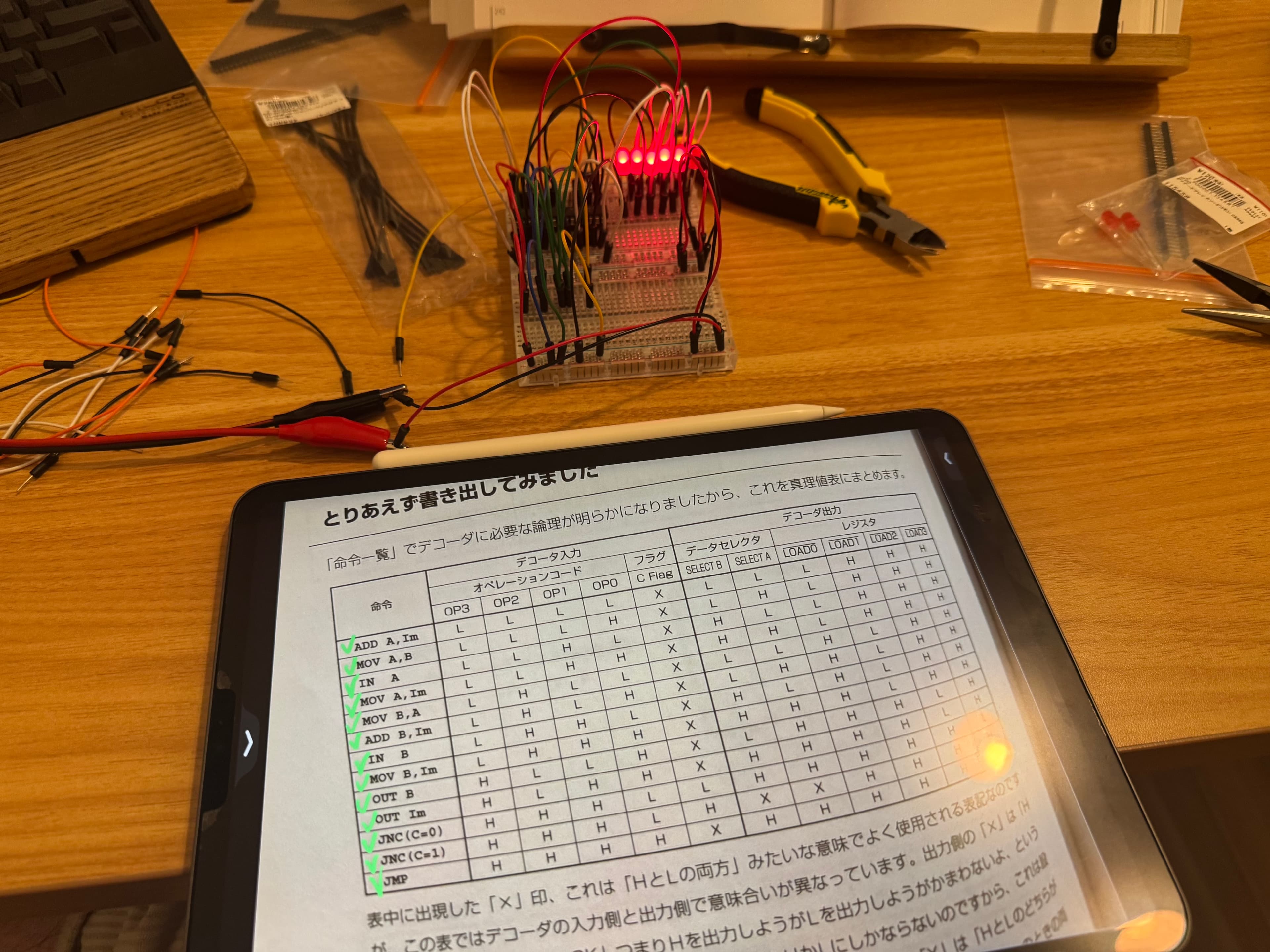 CPU本体については、セレクタ、デコーダ、ALUなどの各部品ごとにブレッドボードで組み立てました。なるべく全てのICで動作を確認したあとにはんだ付けに入れるようにしました。