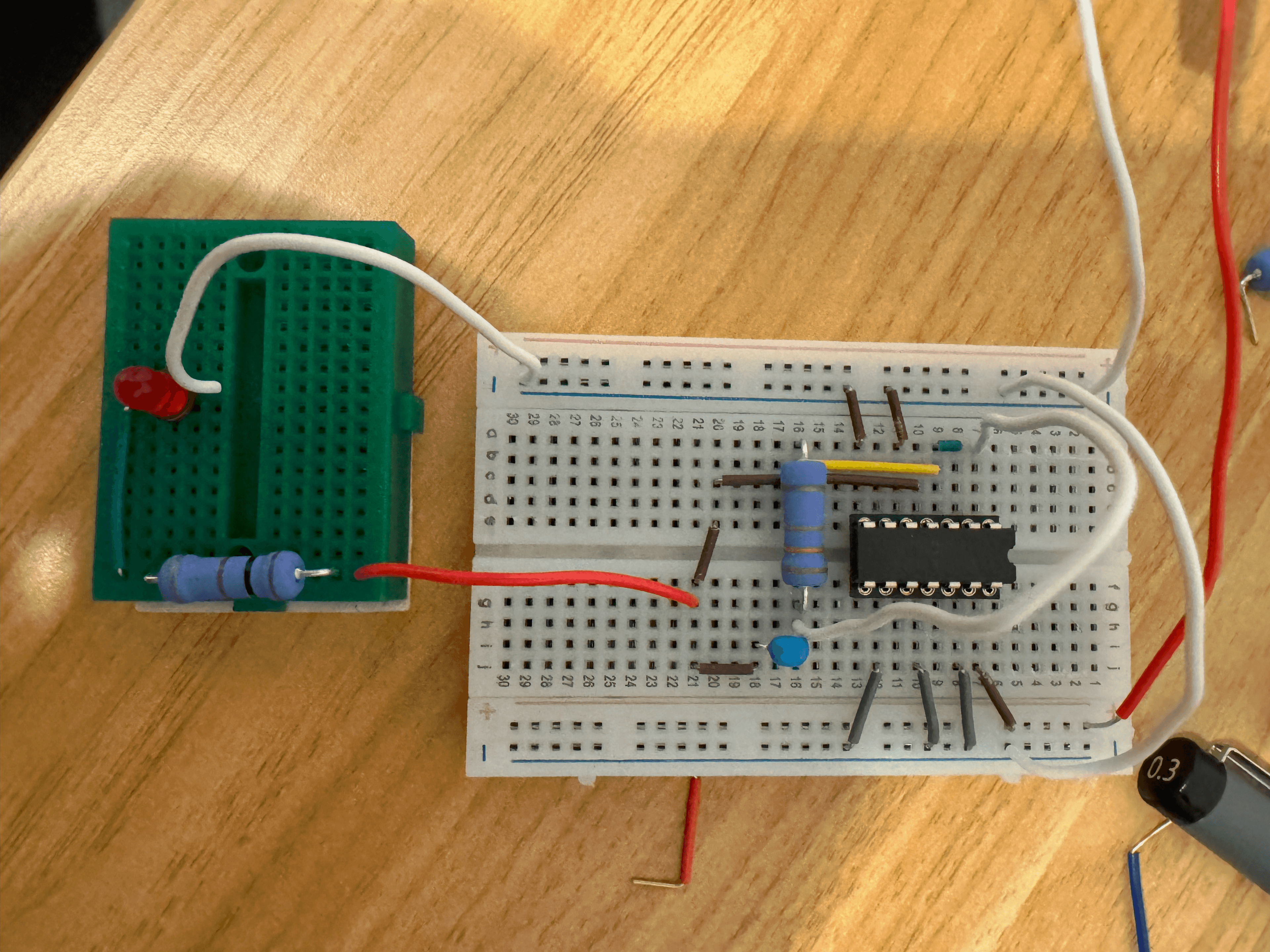 私はこれまで電子工作にほとんど触れたことがなかったため、1章から飛ばすことなく読みました。当然ながらはんだ付けもしたことがなかったので、最初はブレッドボードを使って回路を組み立て、記載されているとおりに動作するかを確認しました。発振回路を作るためのコンデンサーの充電・放電の過程や、それぞれのICの入力に対する出力結果などは、ブレッドボード上で実際に組み立てながらひとつずつ動作を確認して進めました。