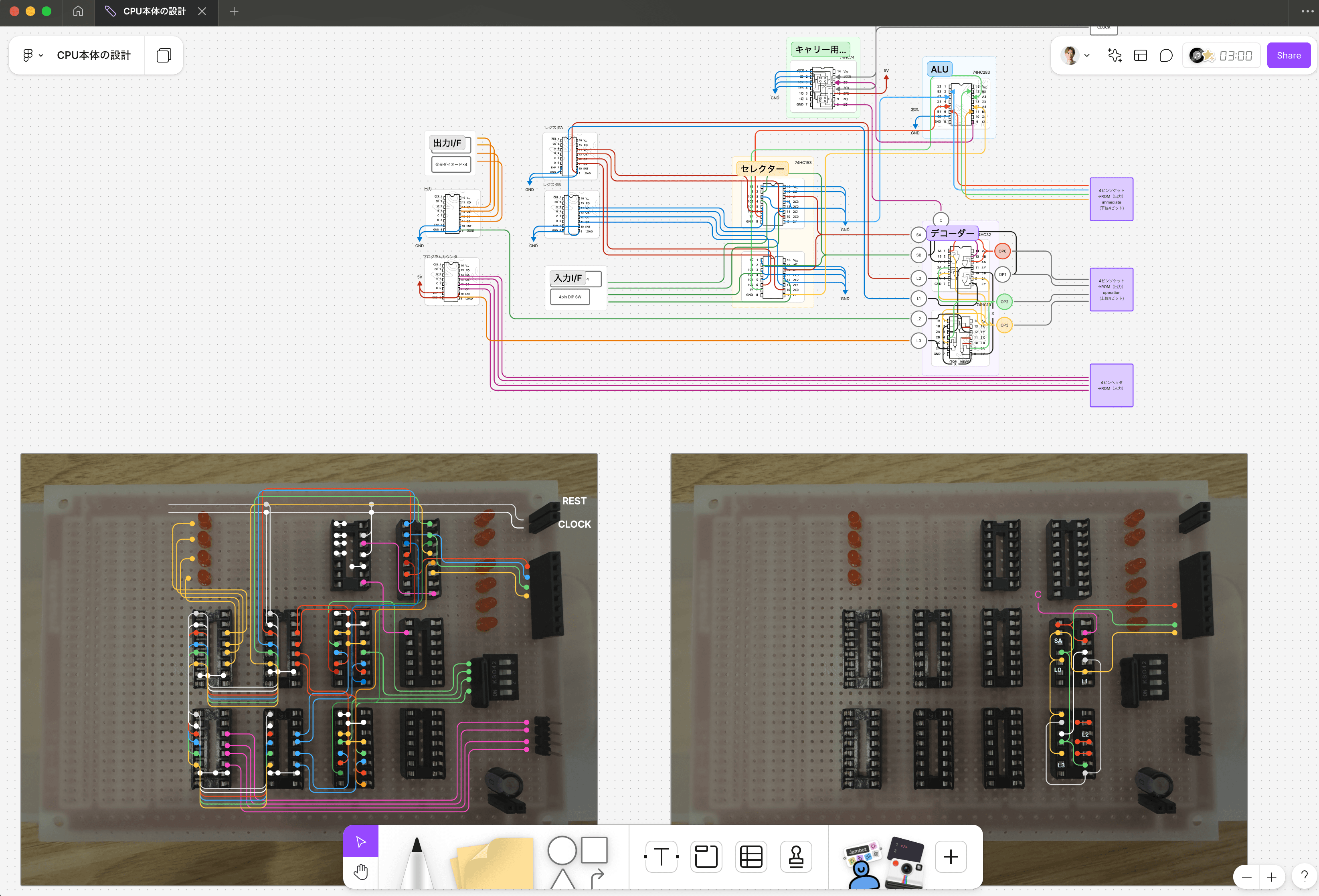 回路の設計には、専用のCADなどがあることは知っていましたが、FigJamを利用してなんとなくの配線を書いて済ませました。はんだ付けの際にはこれを裏から見る必要があるため、上下左右を間違えないようにこの画面のスクリーンショットを保存し、左右反転した画像をiPadに表示しながら作業していました。